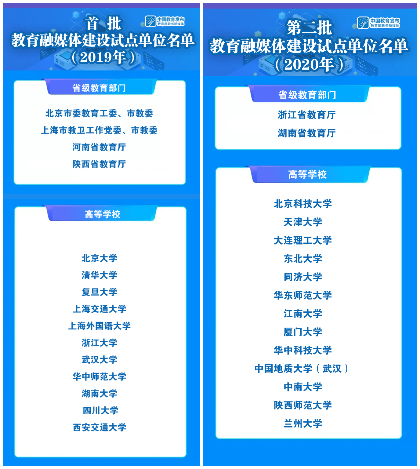 立足教育特色,聚焦立德树人,教育部于2019年5月启动开展教育系统融媒体建设试点工作,确定了北京市委教育工委、市教委,上海市教卫工作党委、市教委,北京大学,清华大学等为首批15家试点单位。为进一步发挥试点引领带动作用,经过自主申报、资格审核、专家审议等程序,教育部确定了第二批教育融媒体建设试点单位。