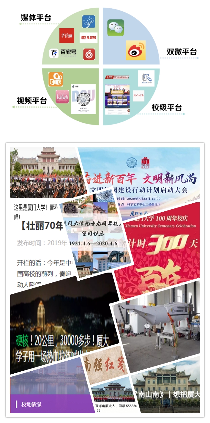 厦门大学党委宣传部积极推进媒体融合向纵深发展,在整合部院资源,打通技术平台,提供智库服务等方面精准发力,努力探索厦门大学融媒体建设道路,提升宣传思想工作的传播力、引导力、影响力、公信力。目前,厦门大学主页年发布新闻1000余条,官方微博粉丝突破100万,官方微信年阅读量已超800万,直播在线观看人数累计超1000万次;多个作品曾获“全国大学生网络文化节”“全国高校网络宣传思想教育优秀作品”“中国高校电视奖”等奖项。