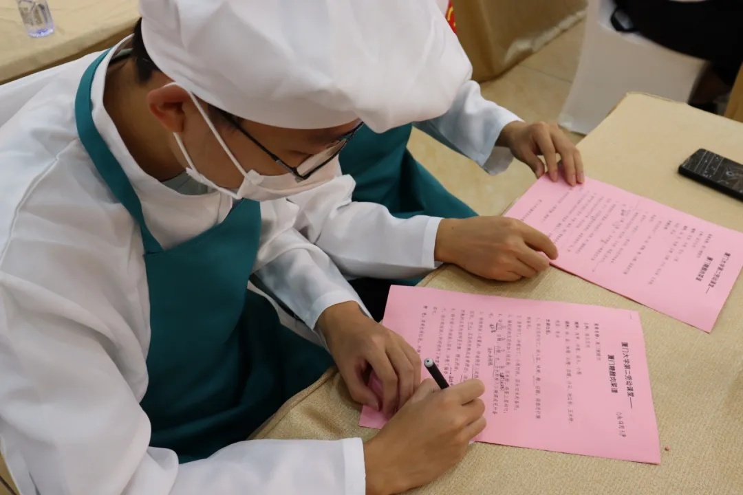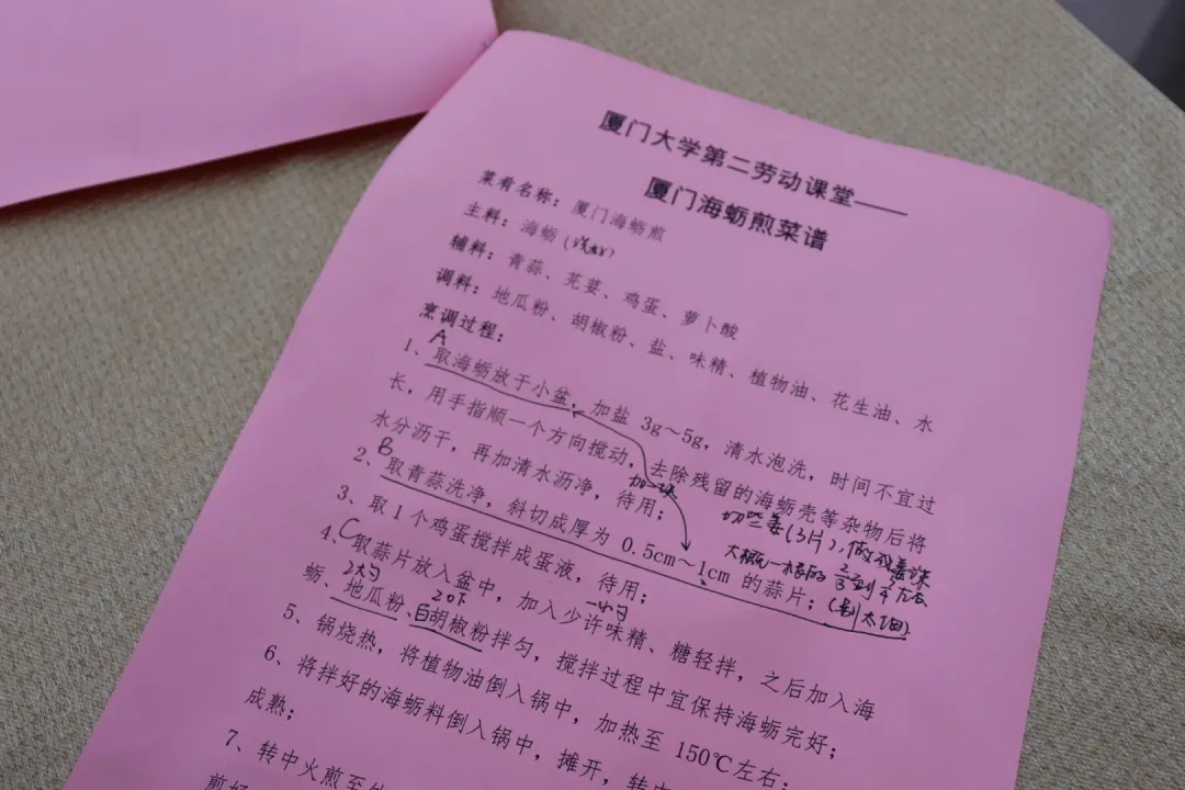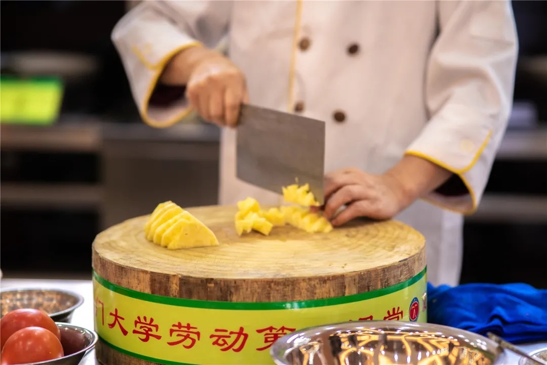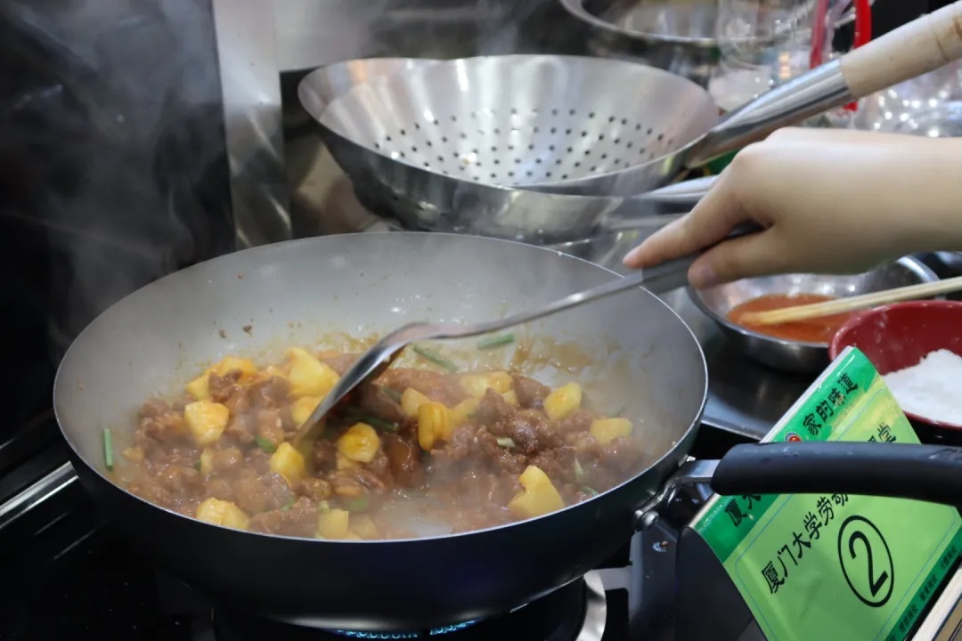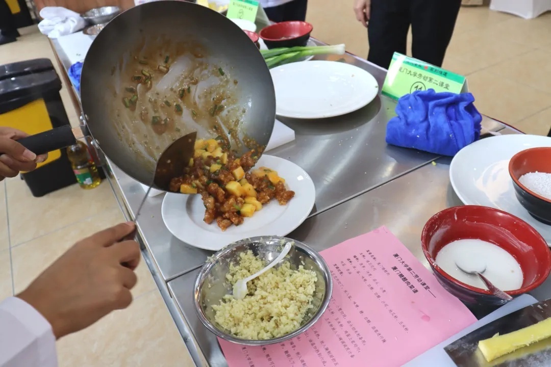 在厨艺课上,同学们跟着来自厦门大学后勤集团的大厨们,学习烹饪糖醋肉和海蛎煎