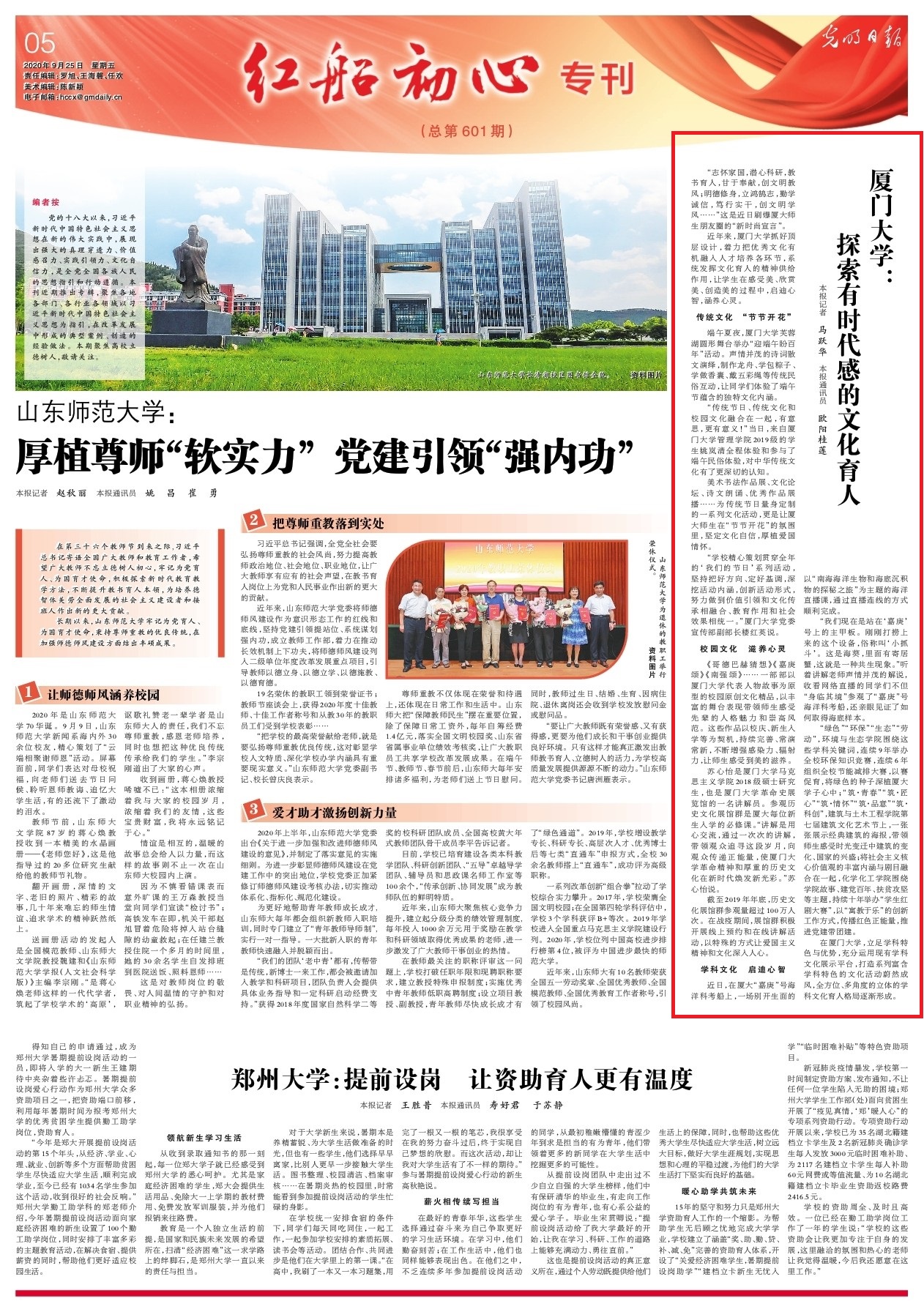 《光明日报》9月25日第五版刊发《厦门大学:探索有时代感的文化育人》深度通讯稿,聚焦我校传统文化、校本文化、学科文化等几个层次,报道我校抓好顶层设计,着力把优秀文化有机融入人才培养各环节,系统发挥文化育人的精神供给作用,让学生在感受美、欣赏美、创造美的过程中,启迪心智,涵养心灵。这也是我校百年校庆宣传系列策划的又一深度重点报道。